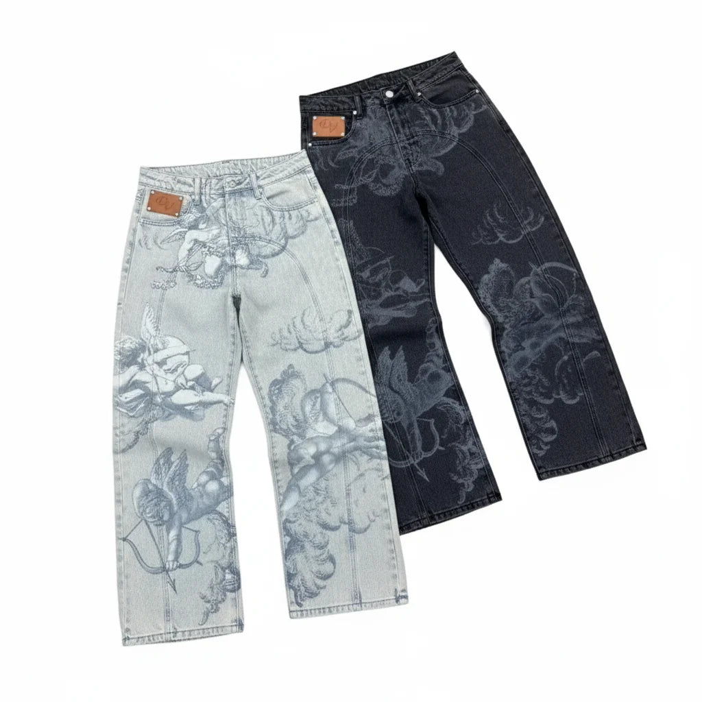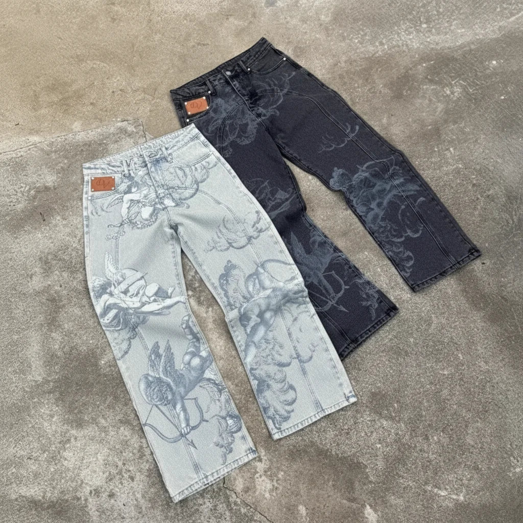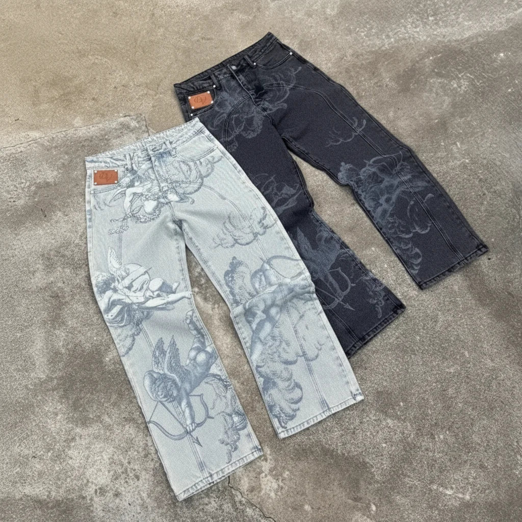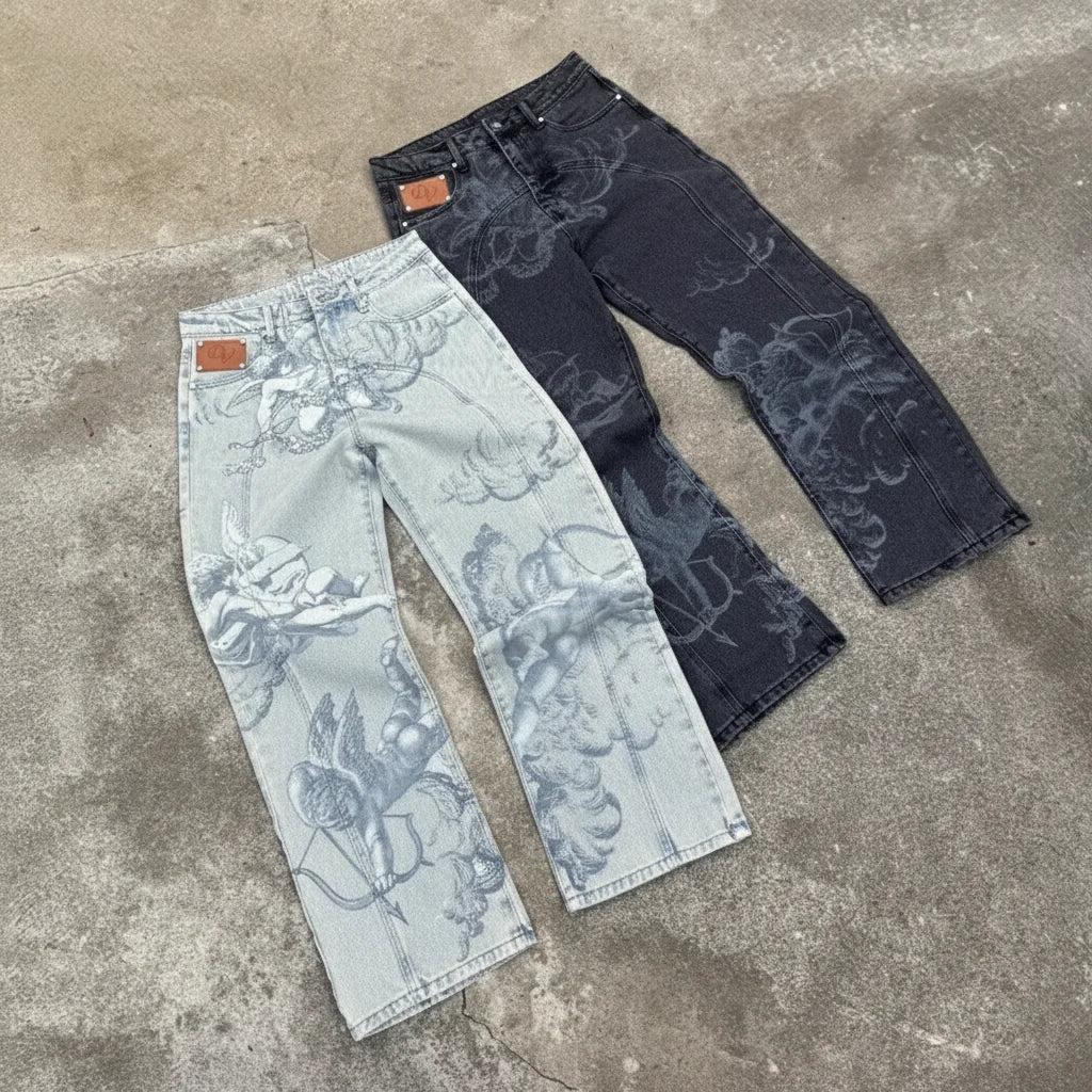 Ce n'est pas juste un jean, c'est ton statement. L'imprimé Flèche de Cupidon? Un vrai throwback qui te donne cette vibe unique. C'est le détail qui fait tout, qui te démarque et t'assure un flow sans pareil. Prêt à faire tourner les têtes avec ton aesthetic?